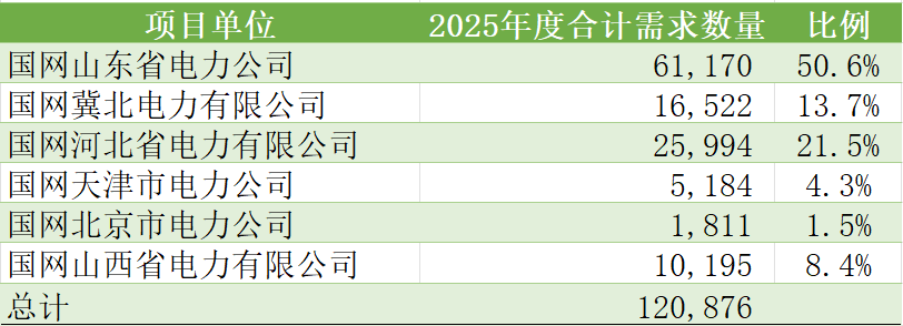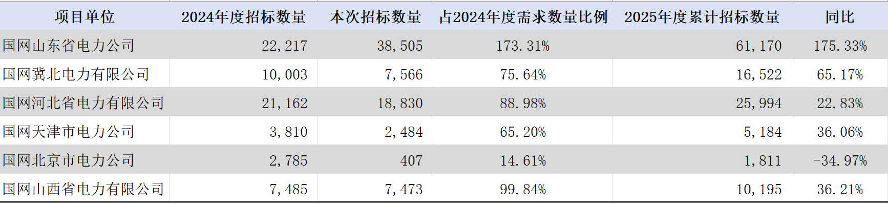 对比不同项目单位在2025年度两个批次的需求情况,山东、河北、山西环比增幅很大;冀北、天津、北京环比不同程度下降。