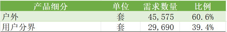 根据货物需求信息,本项目合计需求数量约为75,265套,需求来源于6个项目单位,分成104个标包。